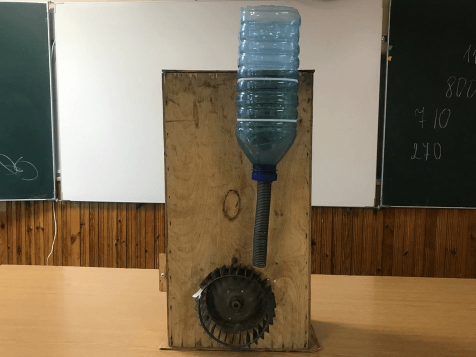 До складу генератора увійшли такі елементи, як двигун від “Волги” дідуся, лопаті, пластикова пляшка на три літри і дерев’яний корпус. Сам же пристрій, за задумом юного інженера, має встановлюватися під ринвою, коли стікає вода і під її тиском крутяться лопаті звідки і виробляється електроенергія.